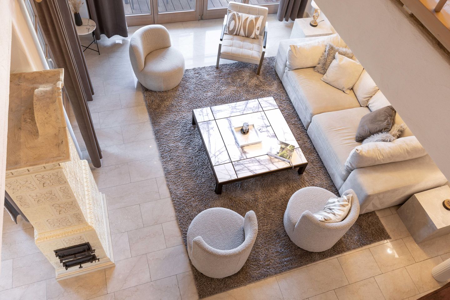 Der helle, offen gestaltete Wohn- und Essbereich ist mit hochwertigen Möbeln ausgestattet und verfügt über raumhohe Fenster, die eine elegante alpine Atmosphäre mit Panoramablick auf die Berge schaffen und direkten Zugang zu zwei Balkonen im unteren Bereich bieten. Ein dritter Balkon befindet sich auf der oberen Ebene, der an eines der Schlafzimmer angeschlossen ist und eine noch spektakulärere Aussicht bietet.