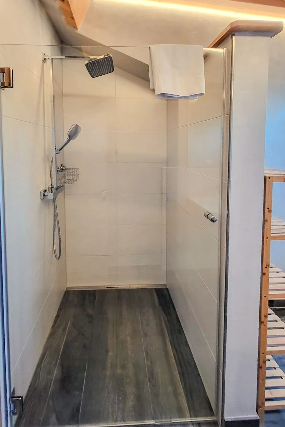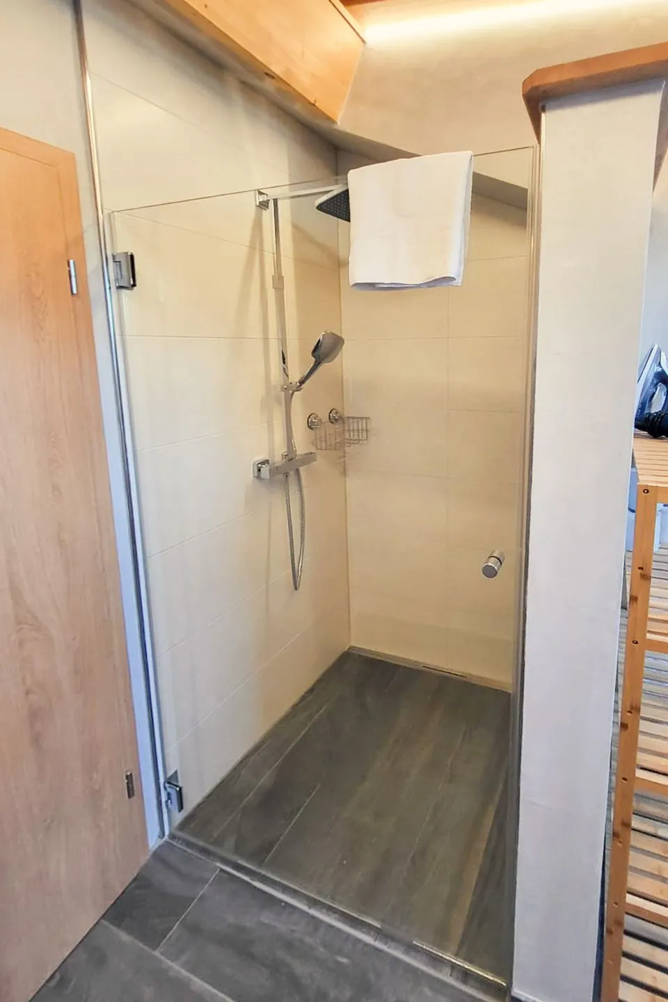 Im modern ausgestatteten Bad trifft Funktionalität auf Stil: Eine geräumige, ebenerdige Dusche mit Regenbrause, hochwertige Armaturen sowie ein Boden in eleganter Holzoptik bieten Komfort auf hohem Niveau. Ein hochliegendes Fenster sorgt für angenehmes Tageslicht, ohne die Privatsphäre zu beeinträchtigen. Auch an längere Aufenthalte ist gedacht – mit ausreichend Platz für eine Waschmaschine.