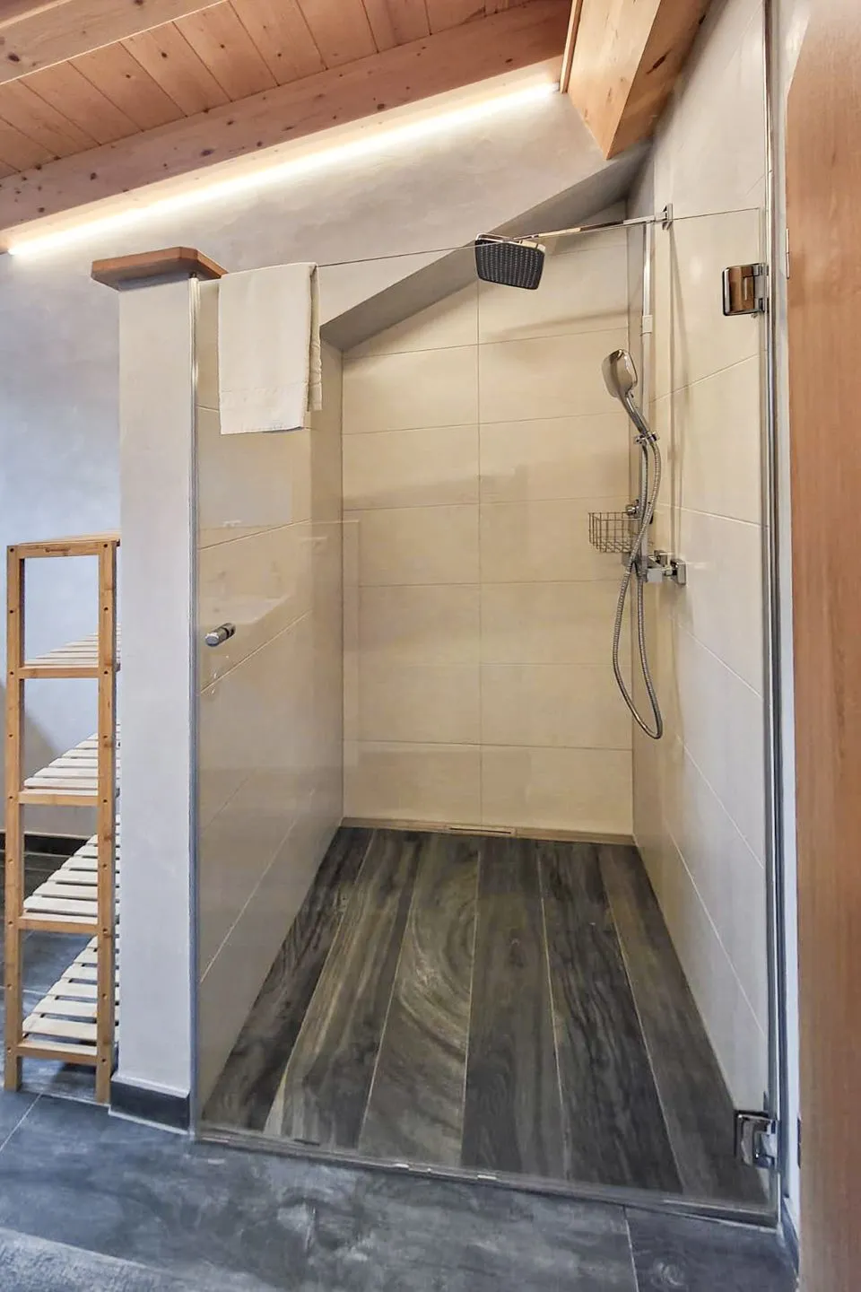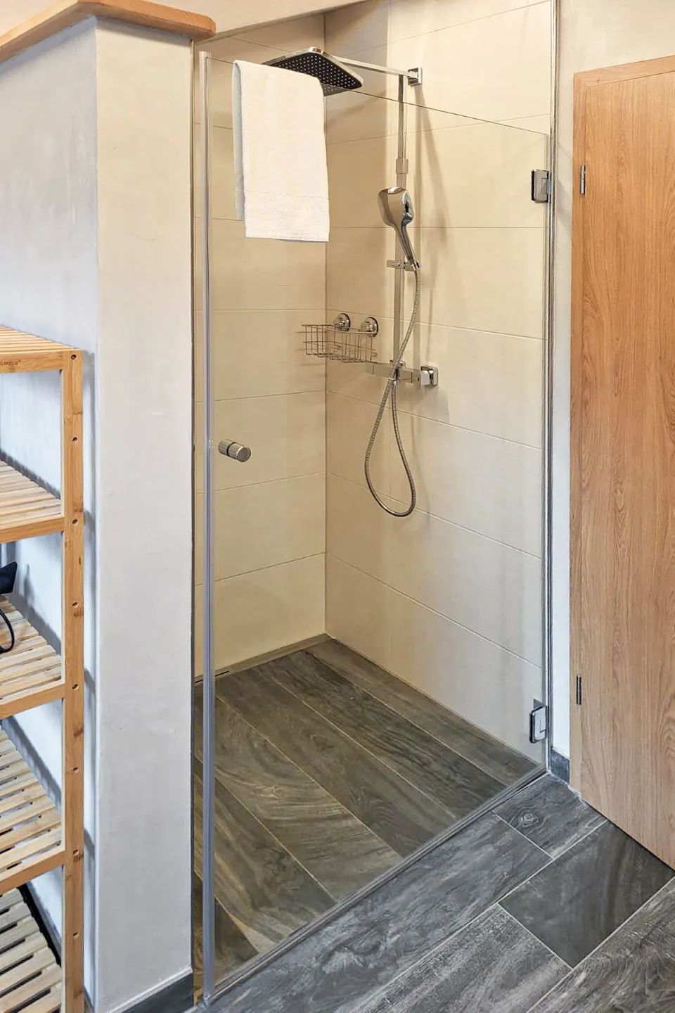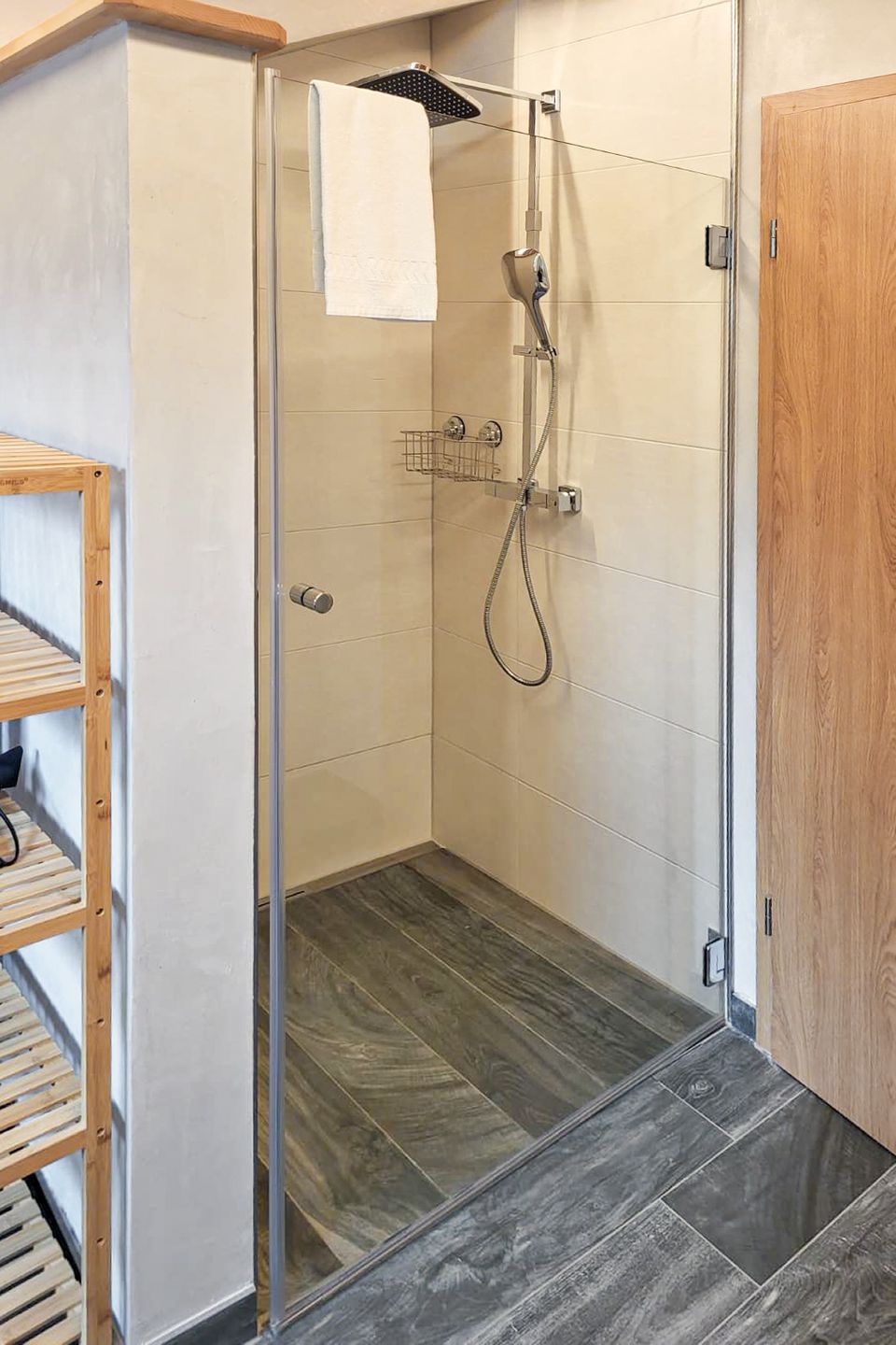 Das moderne Badezimmer ist mit hochwertigen Armaturen und einem stilvollen Fliesenboden in Holzoptik ausgestattet. Eine großzügige, ebenerdige Dusche mit Regenbrause bietet Komfort, ein hochliegendes Fenster bringt natürliches Licht ins Bad, ohne die Privatsphäre zu stören. Zudem steht ausreichend Platz für eine Waschmaschine zur Verfügung – besonders praktisch für längere Aufenthalte.