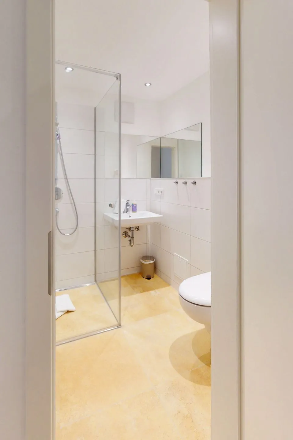 The modern bathroom impresses with a walk-in shower and ensures pleasant comfort.