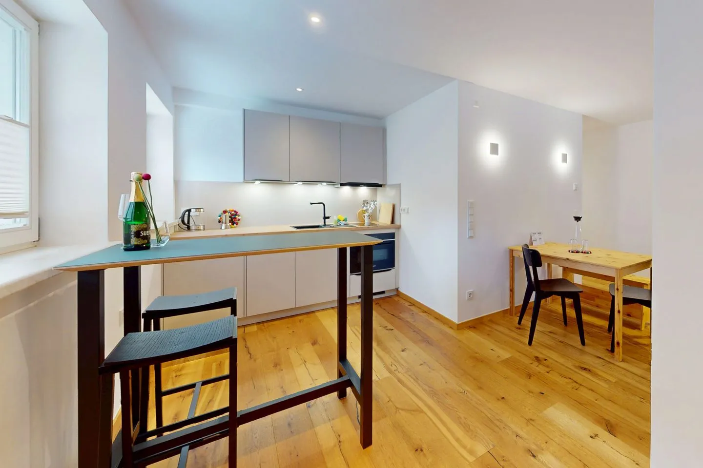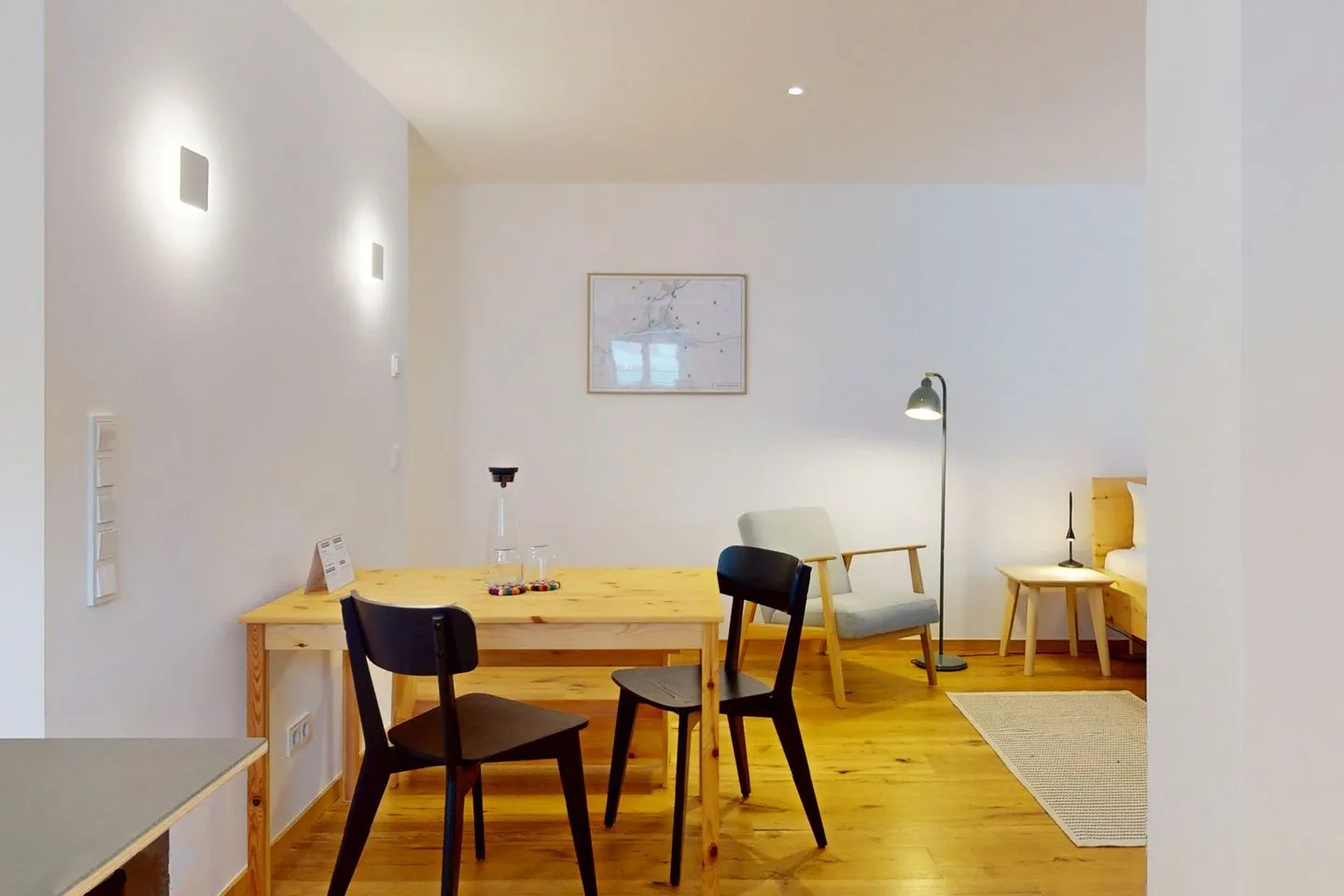 The open kitchenette with a stylish bar table and stools invites you to take a relaxing break, while the cozy dining table with bench and chairs offers enough space for shared meals. The comfortable bed and comfy armchair make the apartment a place to relax.